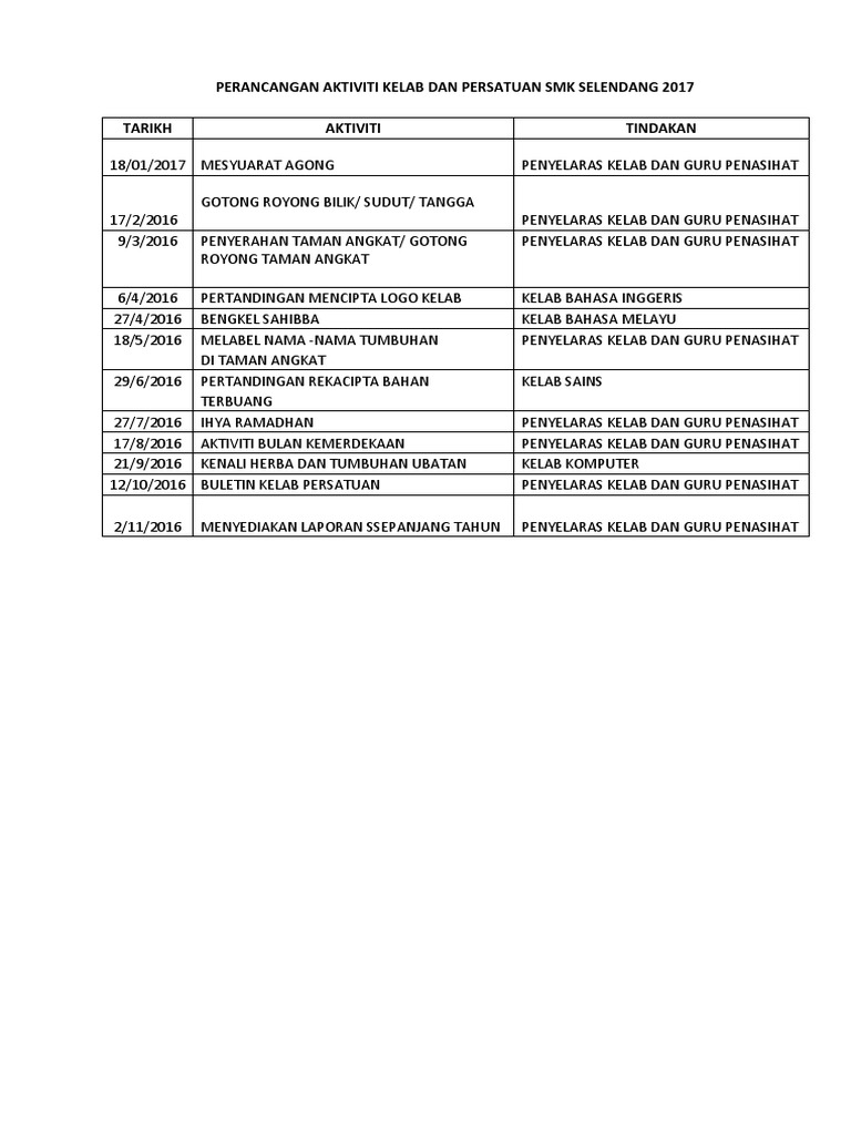 Perancangan Aktiviti Kelab Dan Persatuan Smk Selendang 2017