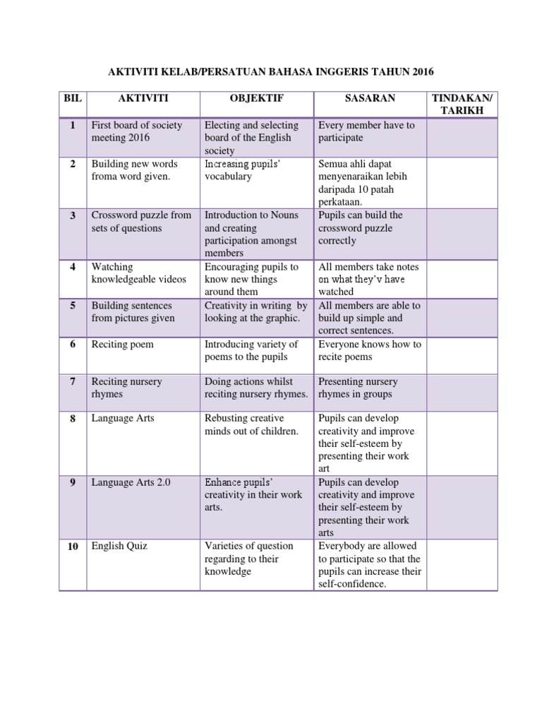 Doc Perancangan Aktiviti Persatuan Bahasa Inggeris Tahun 4 2015 Rohani Ibrahim Academia Edu