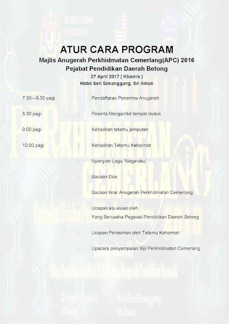 Terlebih dahulu majlis merakamkan sekalung penghargaan dan setinggi tinggi terima kasih terutama kepada yang berbahagia inspektor sollehudin bin zakaria pegawai penyiasat kanan jenayah ipd klang selatan dan semua hadirin di atas kesudian meluangkan masa bersama sama kami dalam menjayakan majlis penyampaian anugerah kecemerlangan hem dan kokurikulum smk kampong jawa untuk 2016. Muhammad sukri bin saud fssh. Aturcara majlis sambutan hari perkhidmatan awam negara brunei darussalam kali ke 21 2014 9 00 pagi para jemputan hadir 9 30 pagi para jemputan khas dan pembesar pembesar negara hadir. Contoh aturcara majlis anugerah perkhidmatan cemerlang.