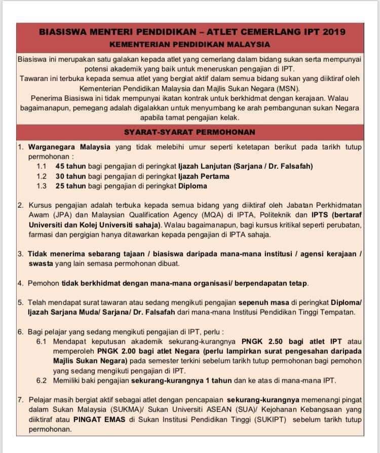 Tawaran Biasiswa Menteri Pendidikan Atlet Cemerlang Ipt Tawaran Biasiswa 2020 2021