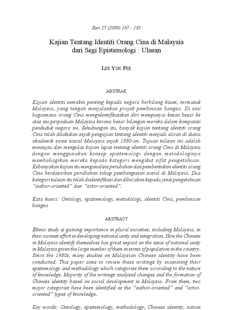 Pdf Kajian Tentang Identiti Orang Cina Di Malaysia Dari Segi Epistemologi Ulasan Yok Fee Lee Academia Edu