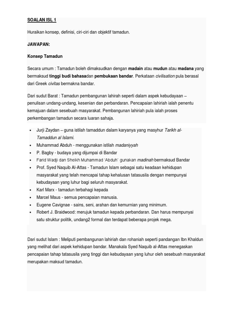 Soalan Isl 1 Huraikan Konsep Definisi Ciri Ciri Dan Objektif Tamadun
