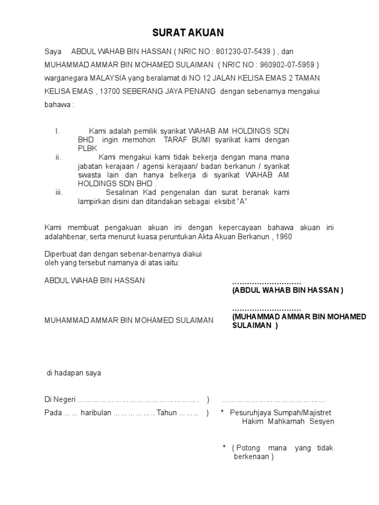 Ini Adalah Contoh Surat Akuan Yang Pesuruhjaya Sumpah Plaza Masalam Seksyen 9 Shah Alam Facebook