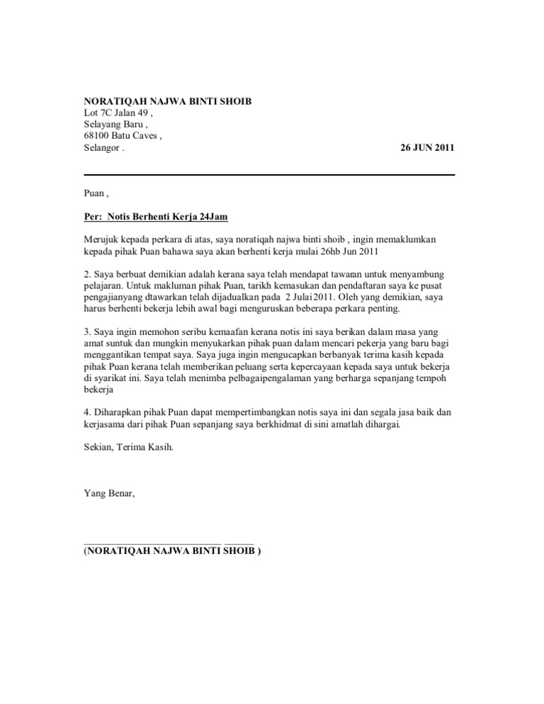 Contoh surat berhenti kerja 24 jam pdf free 13 sep 2018. 6 jun 2014. Jenis dan format surat berhenti kerja notis 24 jam. Oleh itu sila rujuk contoh contoh di bawah untuk menulis surat atau resignation letter mengikut format yang dikehendaki mengikut kesesuaian seperti 24 jam weeks notice sebulan dan sebagainya.