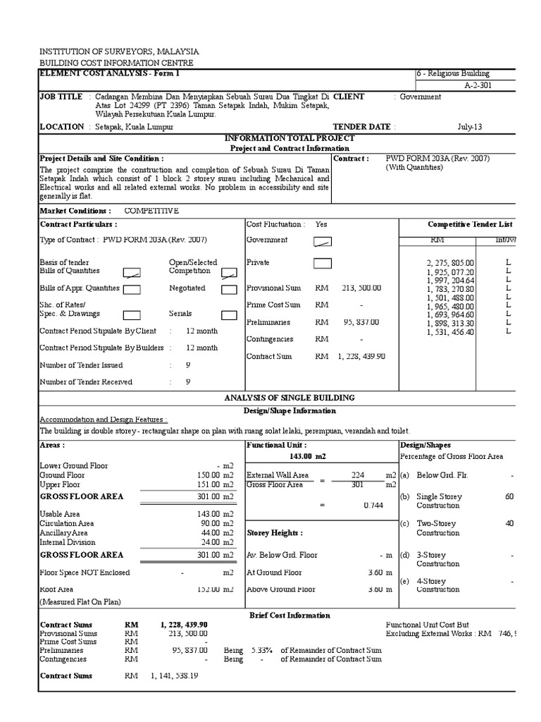 Eca Form Institution Of Surveyors Malaysia Building Cost Information Centre Elemental Cost Analysis Form 1 Job Title Location 8 Residential Buildings Course Hero