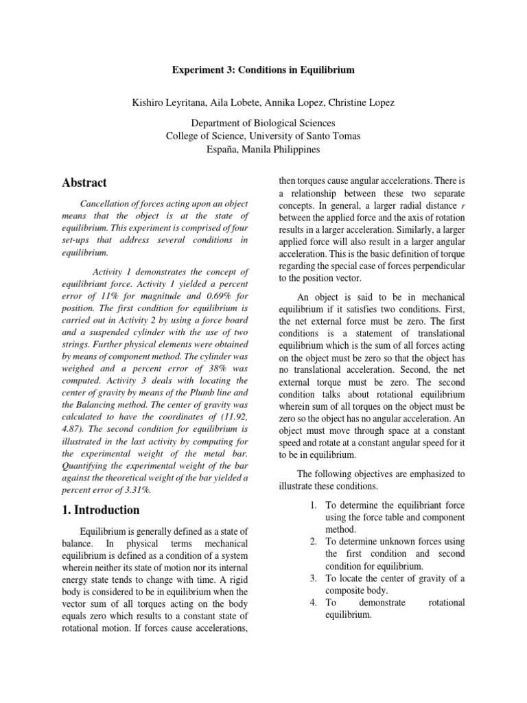 Lab Report Experiment 1 A Moment Of Force Experiment 1 B Study Of Equilibrium Abstract This Experiment Verified That The Sum Of The Clockwise Moments Course Hero
